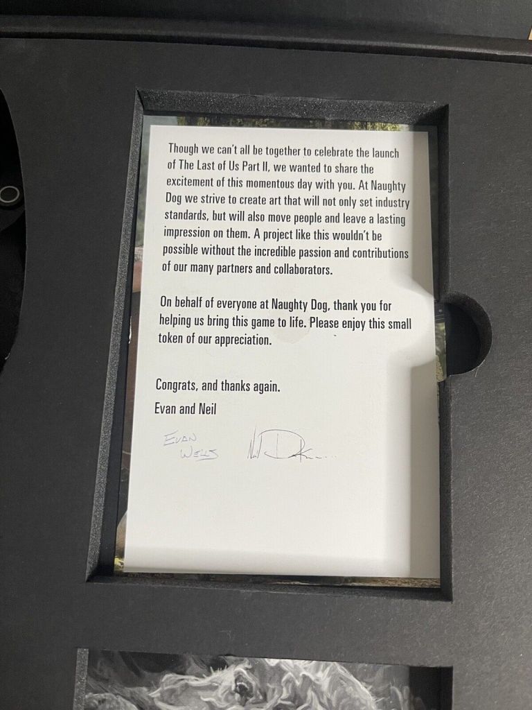 It comes with a controller and a copy of a game, which are exactly the same as the retail versions. Two key arts, signed by Evan and Neil (and perhaps the same in the Dev Kit?)