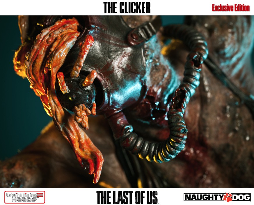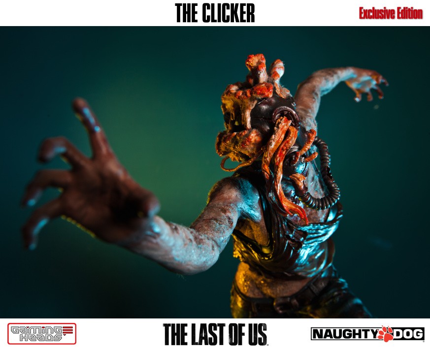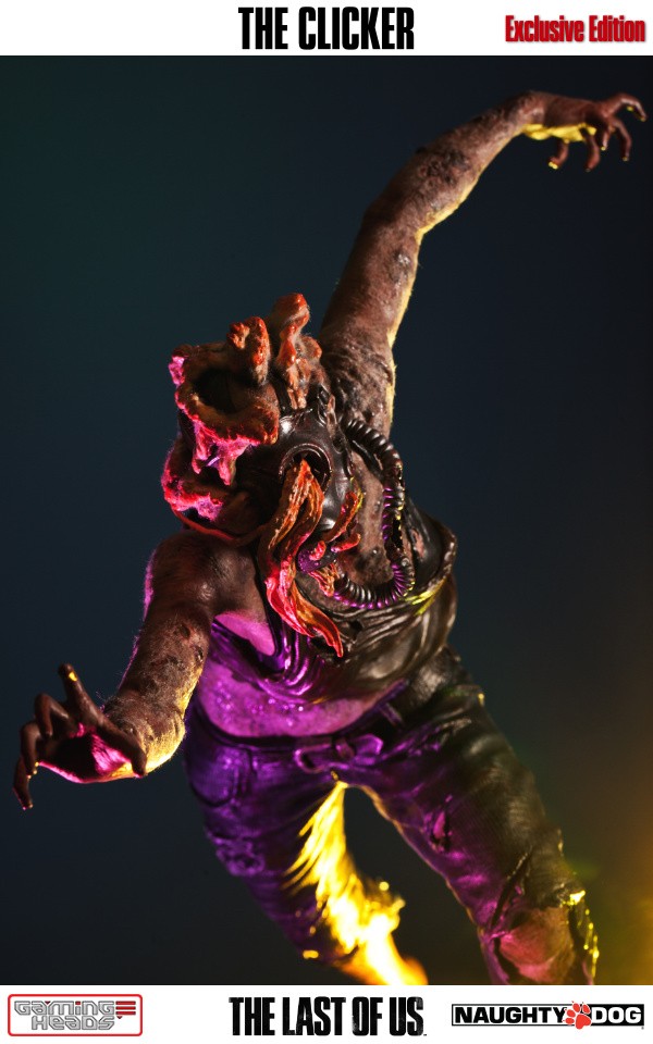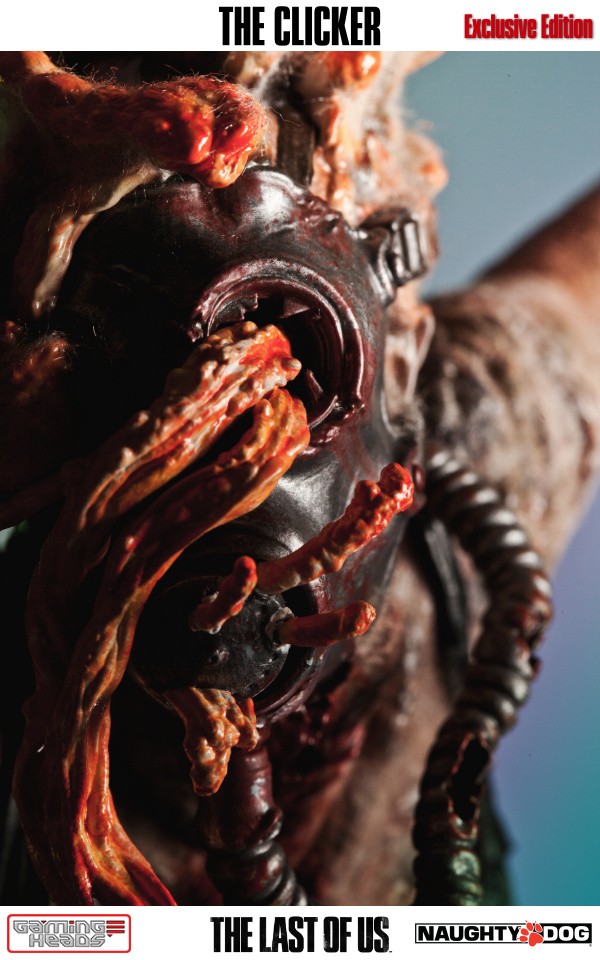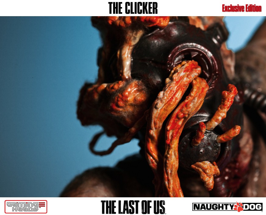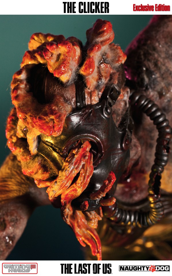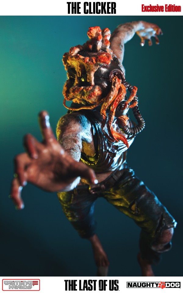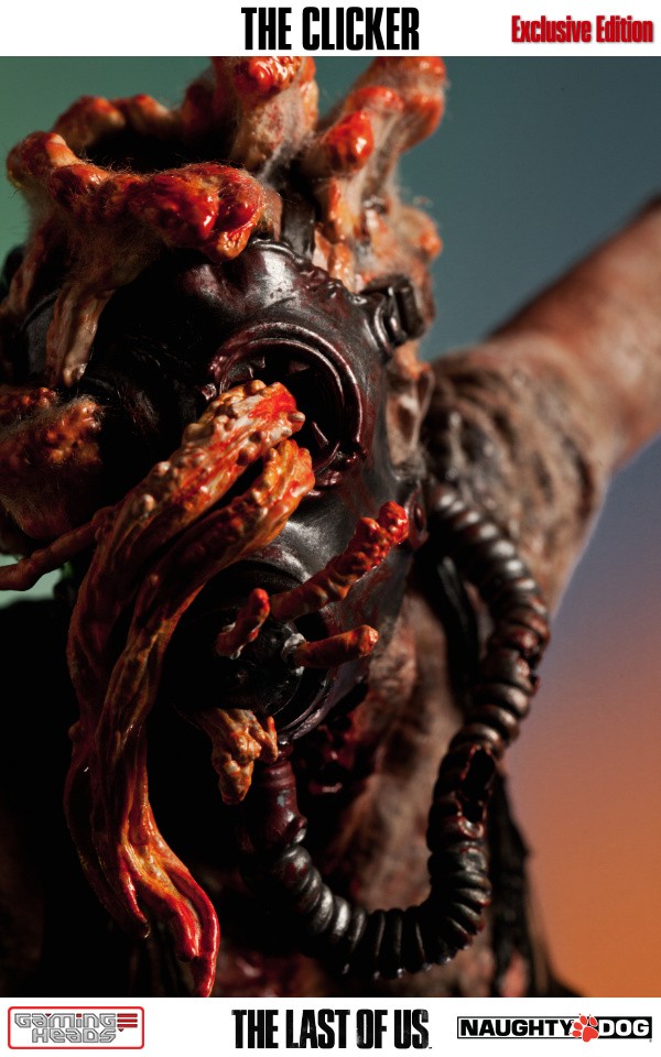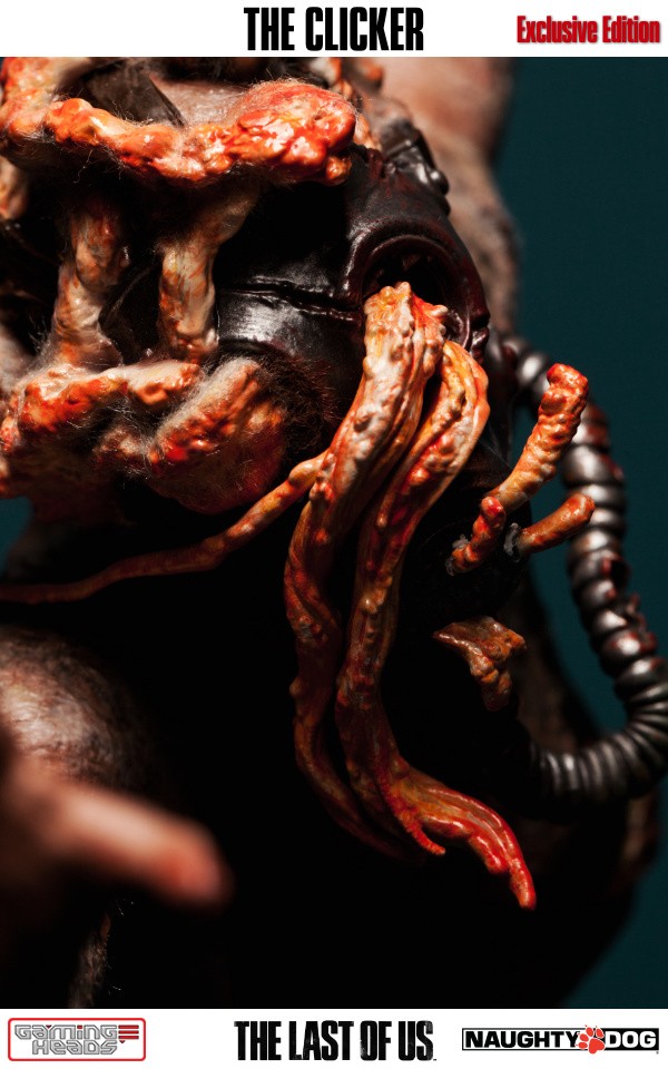 The exclusive version comes with an additional head depicting the clicker with her gas mask and the gory tentacle type infection gouging out of her eyes. The regular style head is also included.