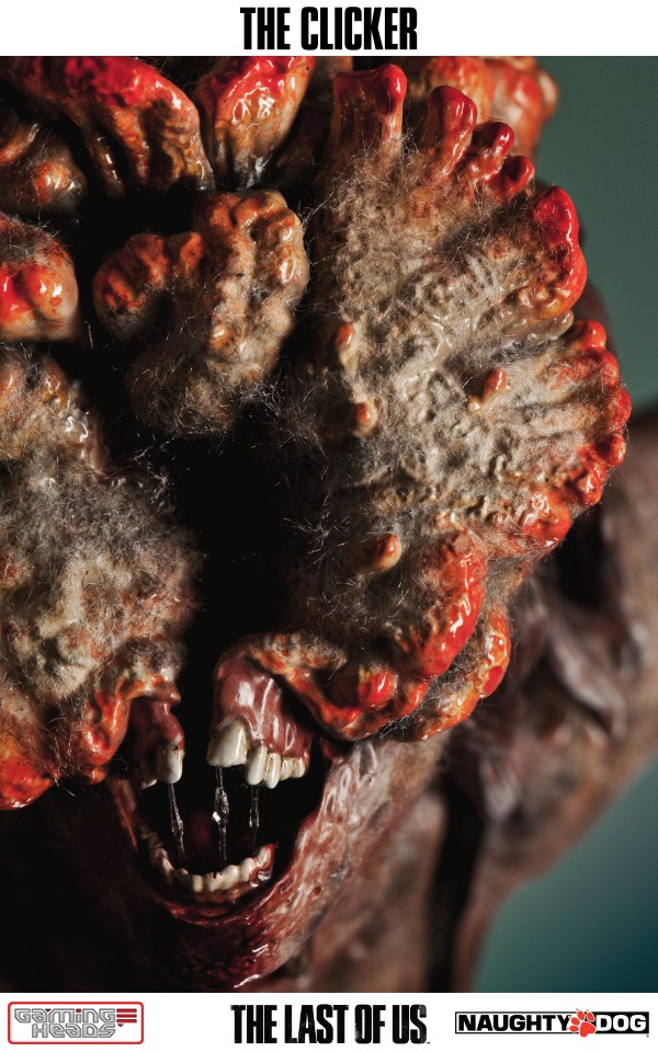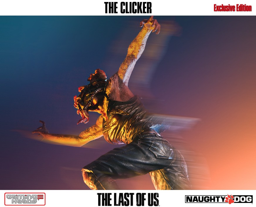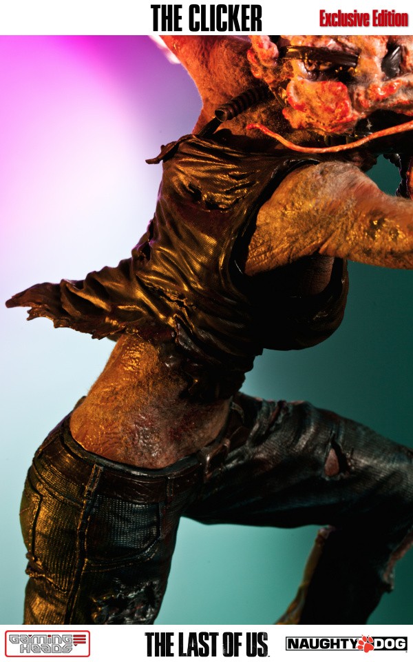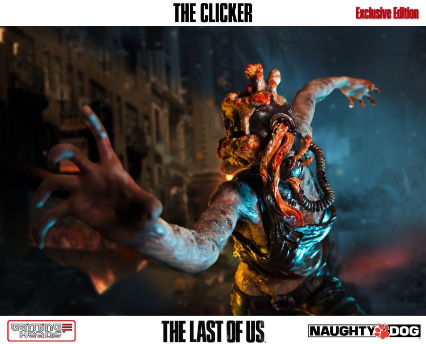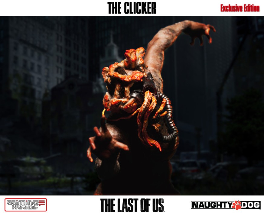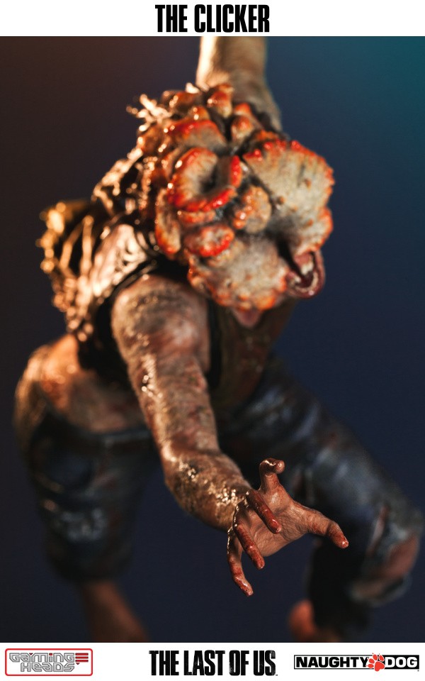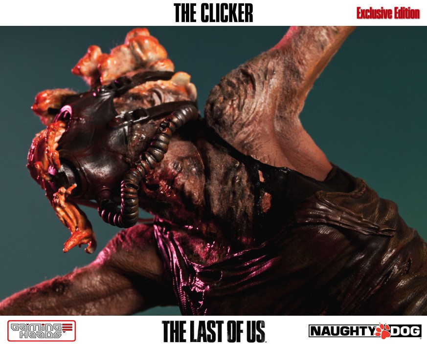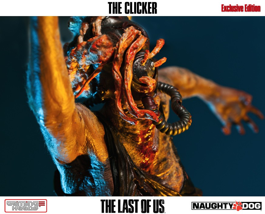 The exclusive version comes with an additional head depicting the clicker with her gas mask and the gory tentacle type infection gouging out of her eyes. The regular style head is also included.