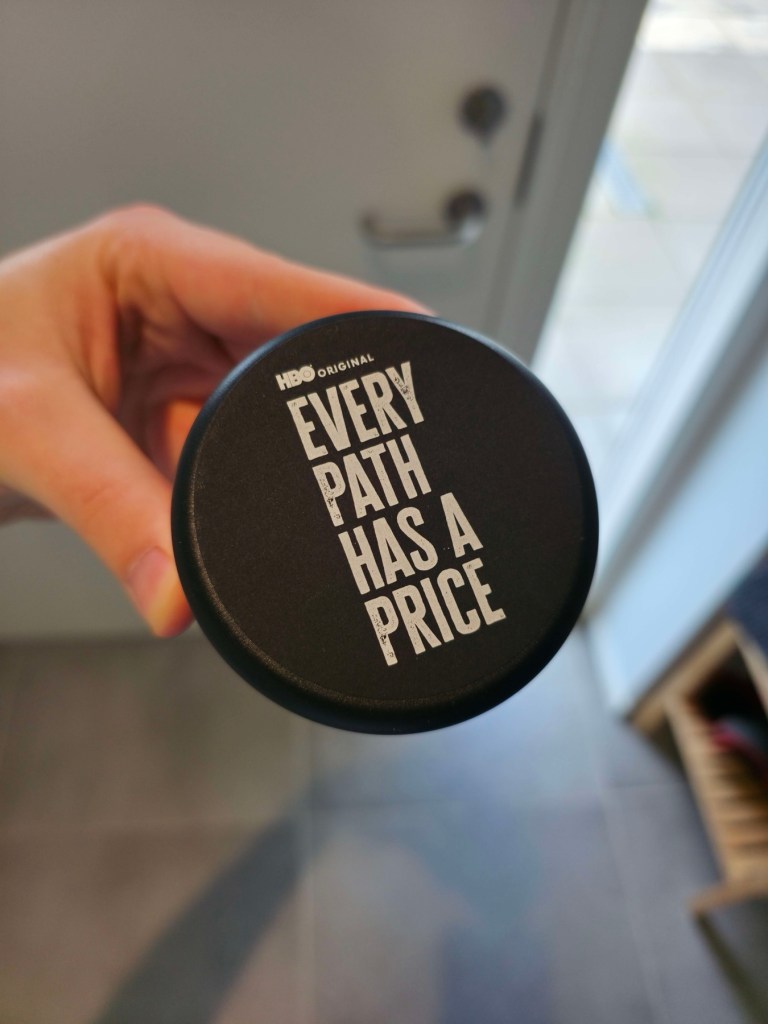 - A whiskey glass with “Every Path Has A Price” written at the bottom